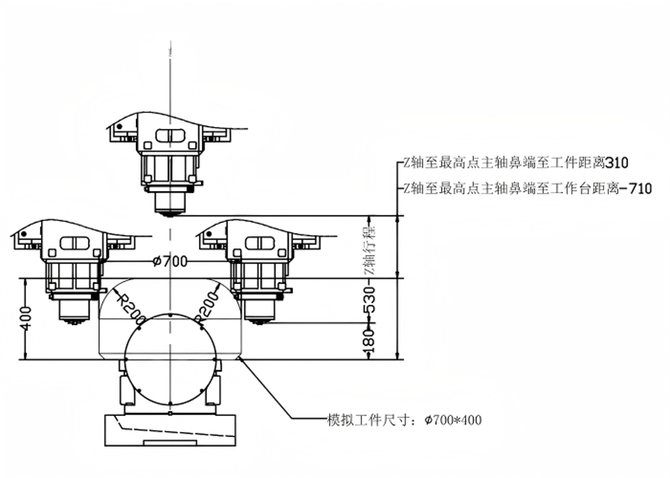 | Simulation Workpiece: Φ700×400 A0/C0、A-90/C0、A30/C0 | Machining Simulation Diagram at A-Axis 0° (Workpiece Φ700×400) |